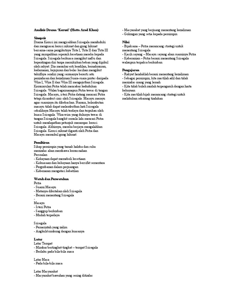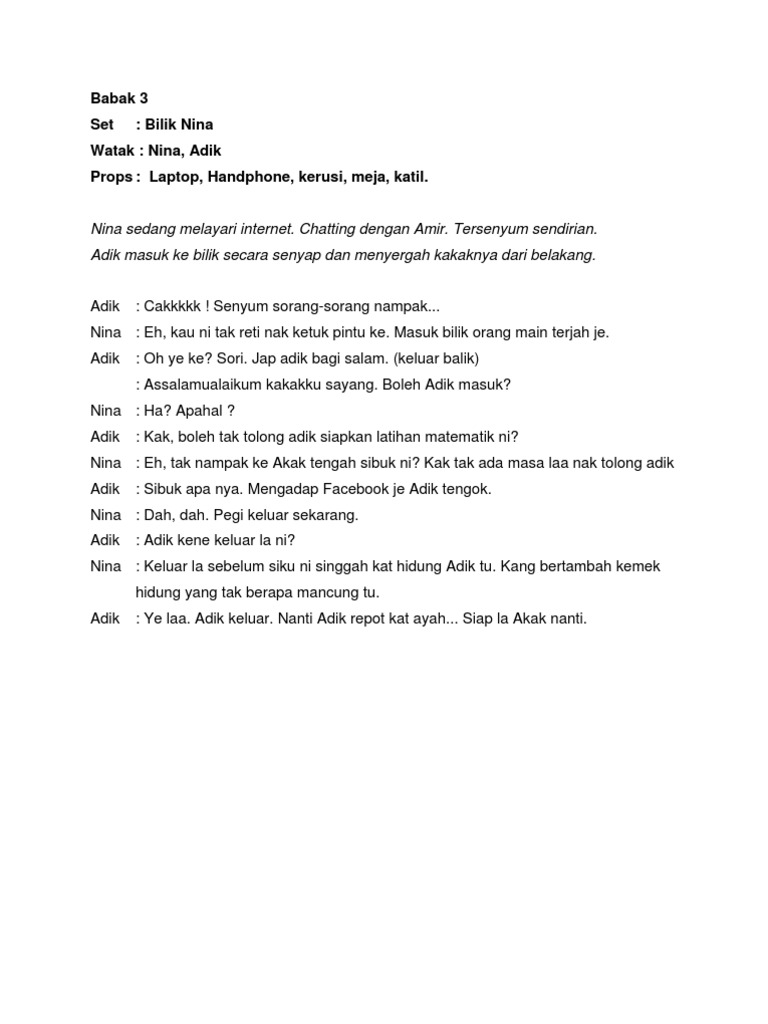 Seorang guru yang tegas 4 pelajar iaitu Amirah Husna Balqis dan Sarah Pelajar 1 Pelajar 2 Pelajar 3 Ibu bapa 1 Ibu bapa 2 Ibu bapa 3 Ibu bapa 4 Pengetua Sekolah Menengah Kebangsaan Kyung-Kyung Pengacara umum keputusan SINOPSIS. Murid membaca skrip drama b. Murid berbincang dalam kumpulan untuk mengenal pasti skrip drama aspek watak tema dan persoalan plot dan sinopsis.